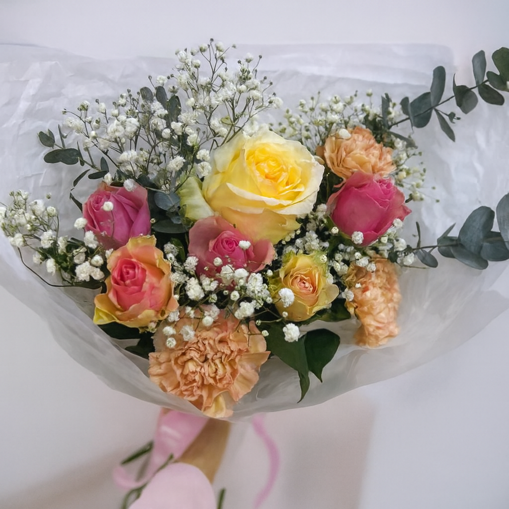 Розы нежных расцветок, гипсофила, диантусы, эвкалипт, оформление